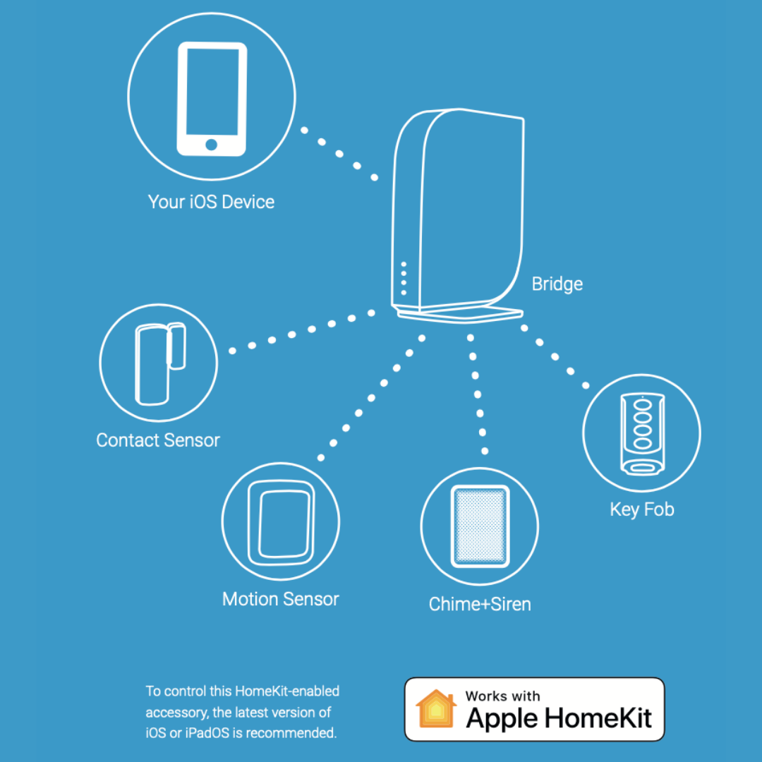 The Ecolink ClearSky Bridge connects to your Apple Device to self-monitor your home through Apple HomeKit. Each of the devices (Contact Sensor, Motion, Chime + Siren and Key Fob) communicates with the Ecolink ClearSky Bridge to send alerts to devices based off activity taking place within your system.